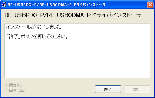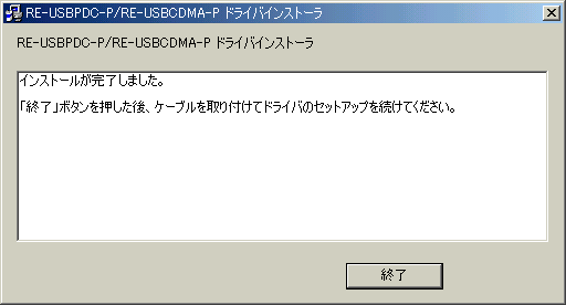 - 圧縮ファイルの解凍が行われInstallShieldによるファイルコピーが開始されます。コピーが終了すると約10秒後に次の画面が表示されますので終了をクリックした後、RE-USB-PDC-PあるいはRE-USB-CDMA-PをパソコンのUSBポートに挿入します。