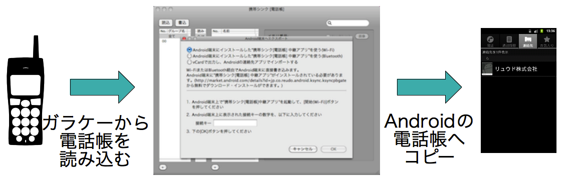 Android携帯電話との間での電話帳のインポート/エクスポート、ガラケーで送受信したメールのAndroid携帯電話での表示を可能にしています。